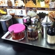 ・卓上調味料:おろしニンニク(緑色)、豆板醤、ラー油、唐辛子、胡椒、醤油、酢、高菜